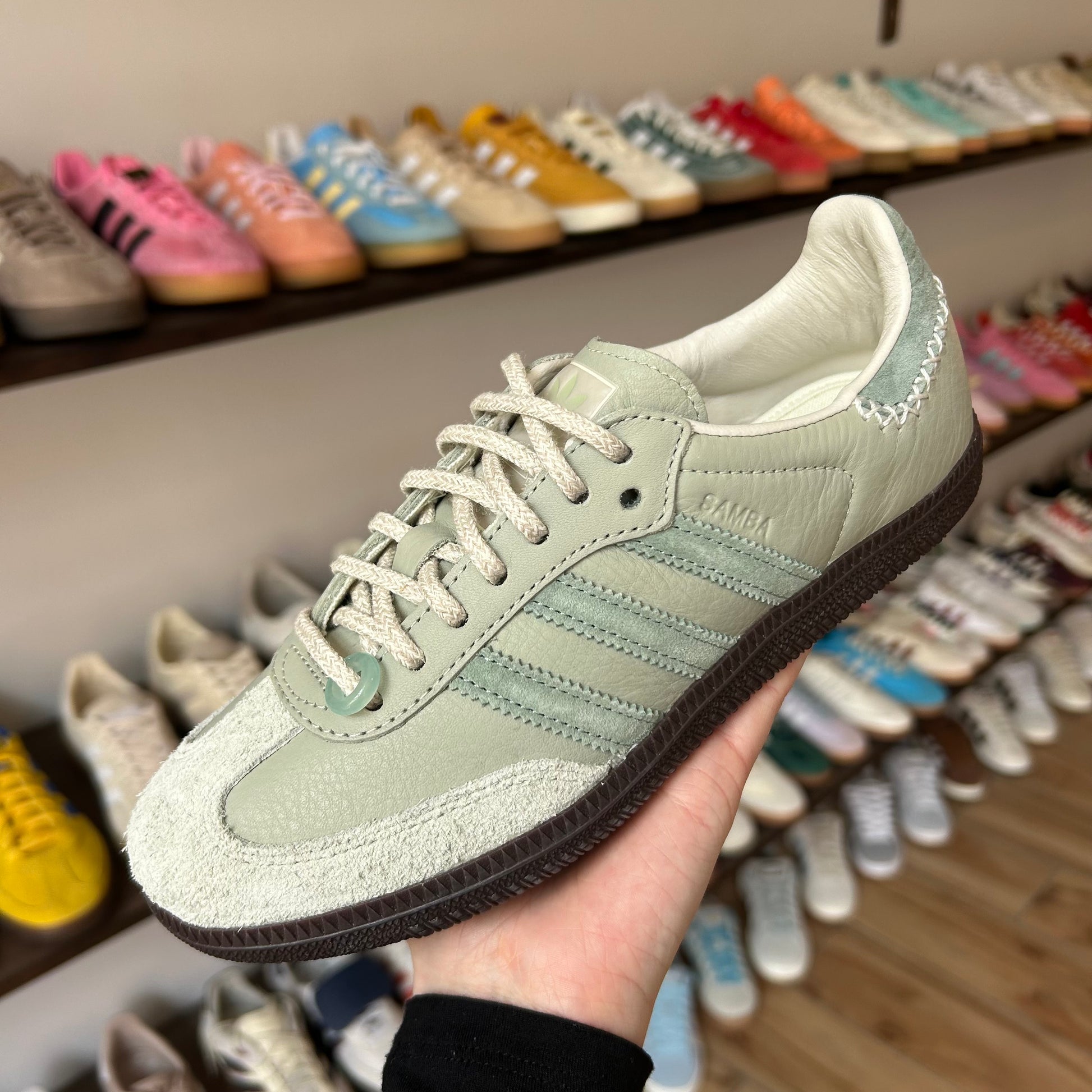 Die adidas Samba OG x MAHA „Half Green“ Edition ist mehr als nur ein Sneaker – sie ist ein Statement für modernen Minimalismus mit einem Hauch Vintage-Flair. In Zusammenarbeit mit dem niederländischen Label MAHA entstanden, verbindet dieser exklusive Drop das zeitlose Design des Samba OG mit einer frischen, organischen Farbpalette und detailverliebter Verarbeitung.